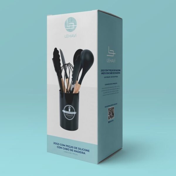 Jogo com 7 Peças de Silicone Preto com Cabo de Madeira
