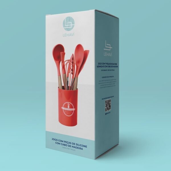 Jogo com 7 Peças de Silicone Vermelho com Cabo de Madeira