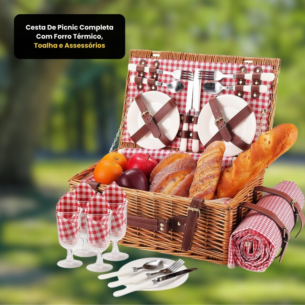 Cesta De Picnic Completa Com Forro Térmico, Toalha e Assessórios