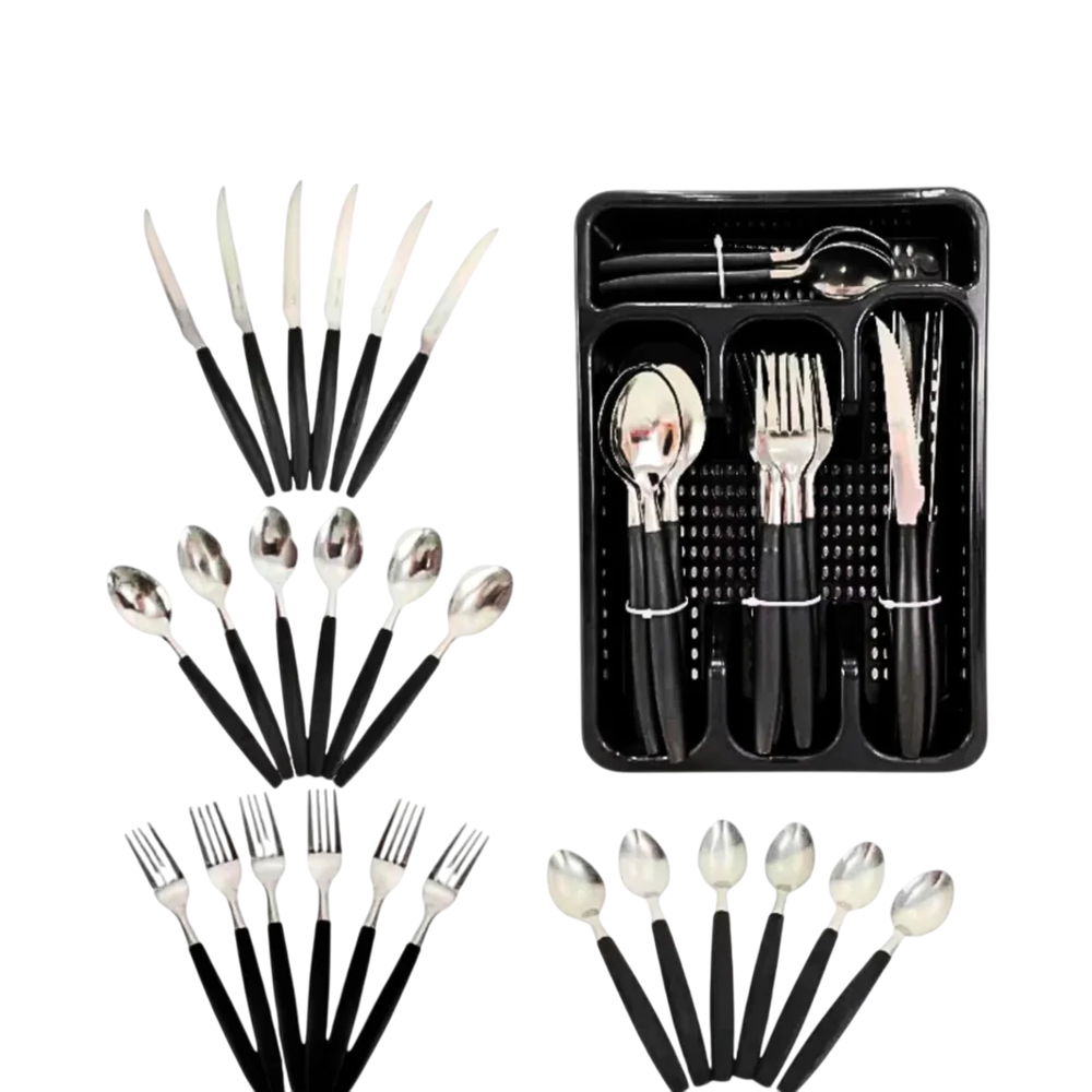 • Completo: Jogo de 25 peças (facas, garfos, colheres de mesa e colheres de chá).