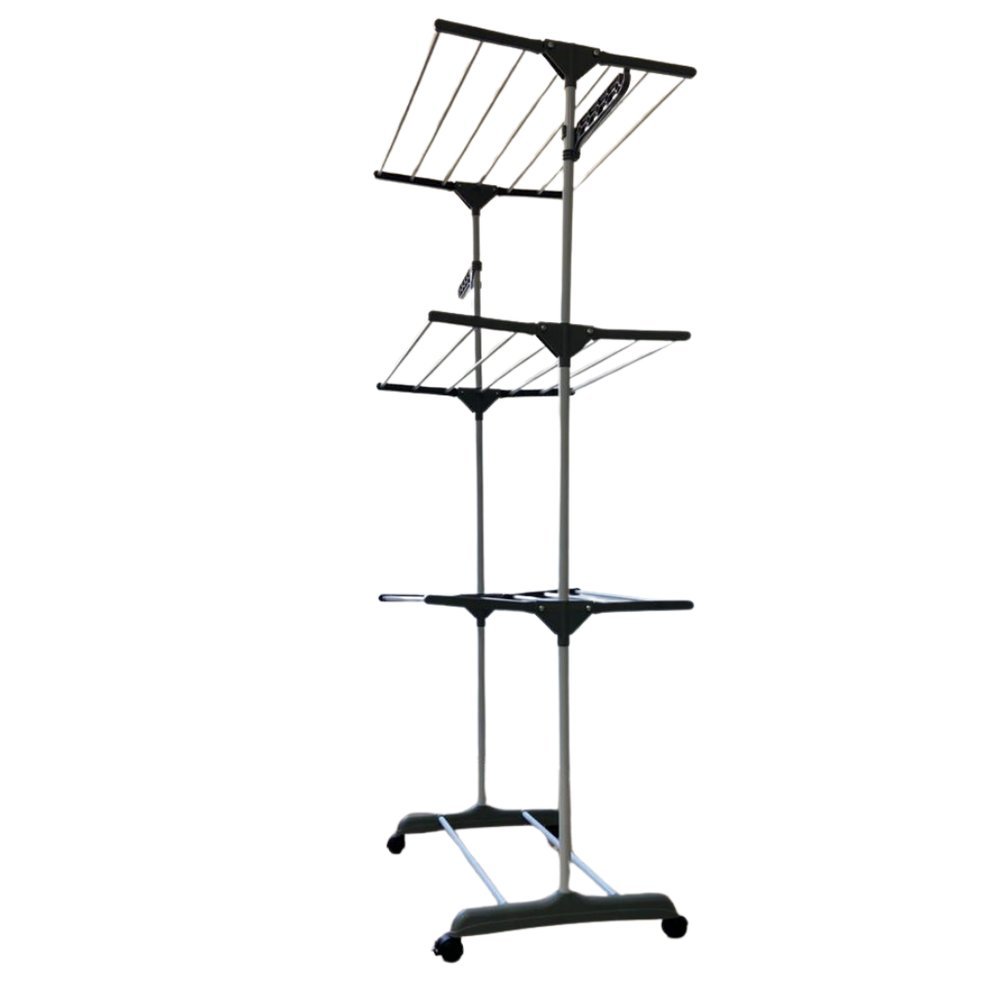 Contém: 01 Multi varal de chão com bandejas e 3 andares Com Cabideiro – Cinza.