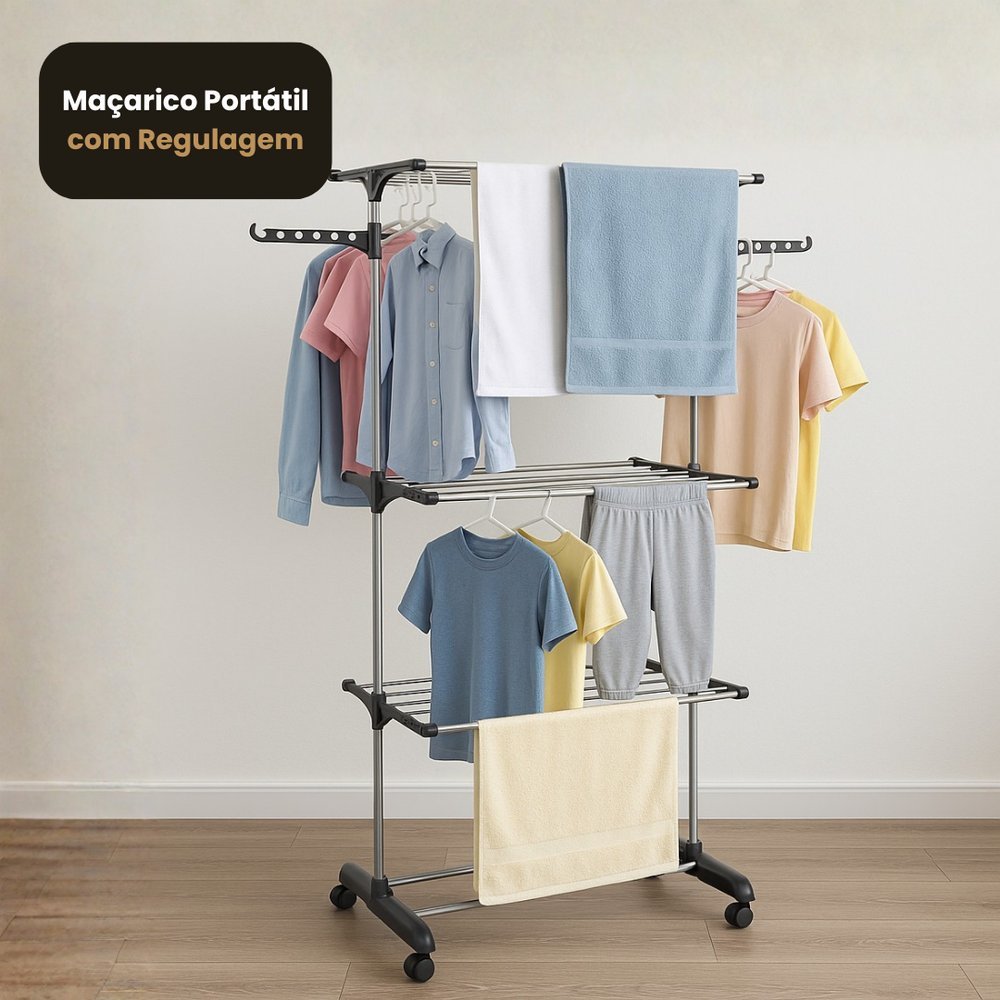 Versatilidade: 3 andares e cabideiros laterais com regulagem de altura/posição.